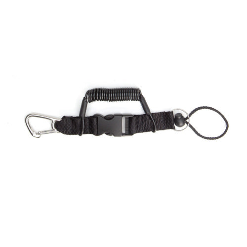 One end has a stainless steel carabiner clip. The other end has a stainless steel split ring and cord with lock