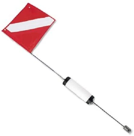 This flag/gloat assembly notifies all who see it that there are divers below. This float can be anchored for stationary use or trailed behind by a diver. A lead weight on the bottom keeps the flag vertical while in the water.