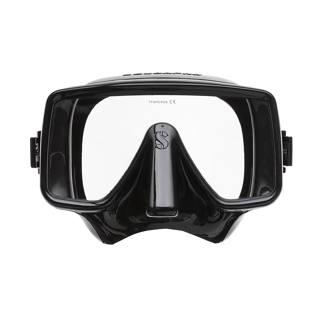 SCUBAPRO's FRAMELESS is diving's original frameless mask, and it's still the best. Its distinctive rectangular single lens shape is classic, providing an excellent field of view on the periphery as well as straight ahead. The soft silicone skirt is comfortable yet durable, and the double-edge seal feels good against the skin. The buckle system is easy to use and allows for quick adjustments. Buckles attach to flexible tabs on the skirt; this optimizes strap angle when dialing in fit. The wide headband spreads the load on the back of the head, greatly enhancing comfort. After decades on the diving scene, the original FRAMELESS continues to be the mask of choice among professional divers throughout the world.