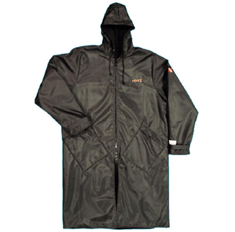 100% waterproof nylon, hook & loop cuffs, lined angled outside front pockets, 2 way heavy duty zipper. Inside pocket, fleece lined drawstring hood, black thermo fleece lined inside, embroidered I-Dive logo with dive flag on the sleeve.