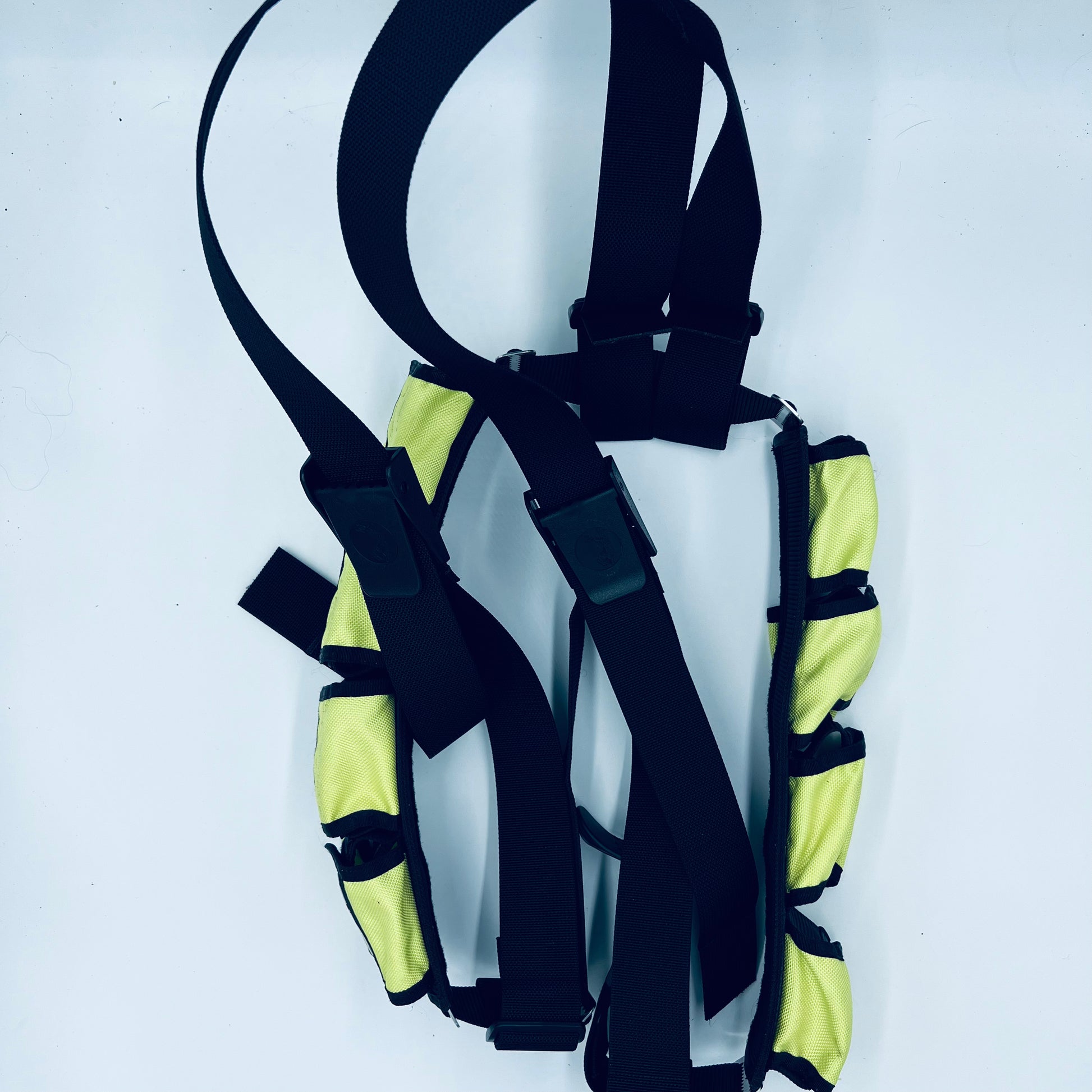 Four pockets on each side made of cordura 1000D and kept in place with five stainless steel weight keepers. 72" total length of belt. The suspenders are adjustable and hold the weight belt in place.