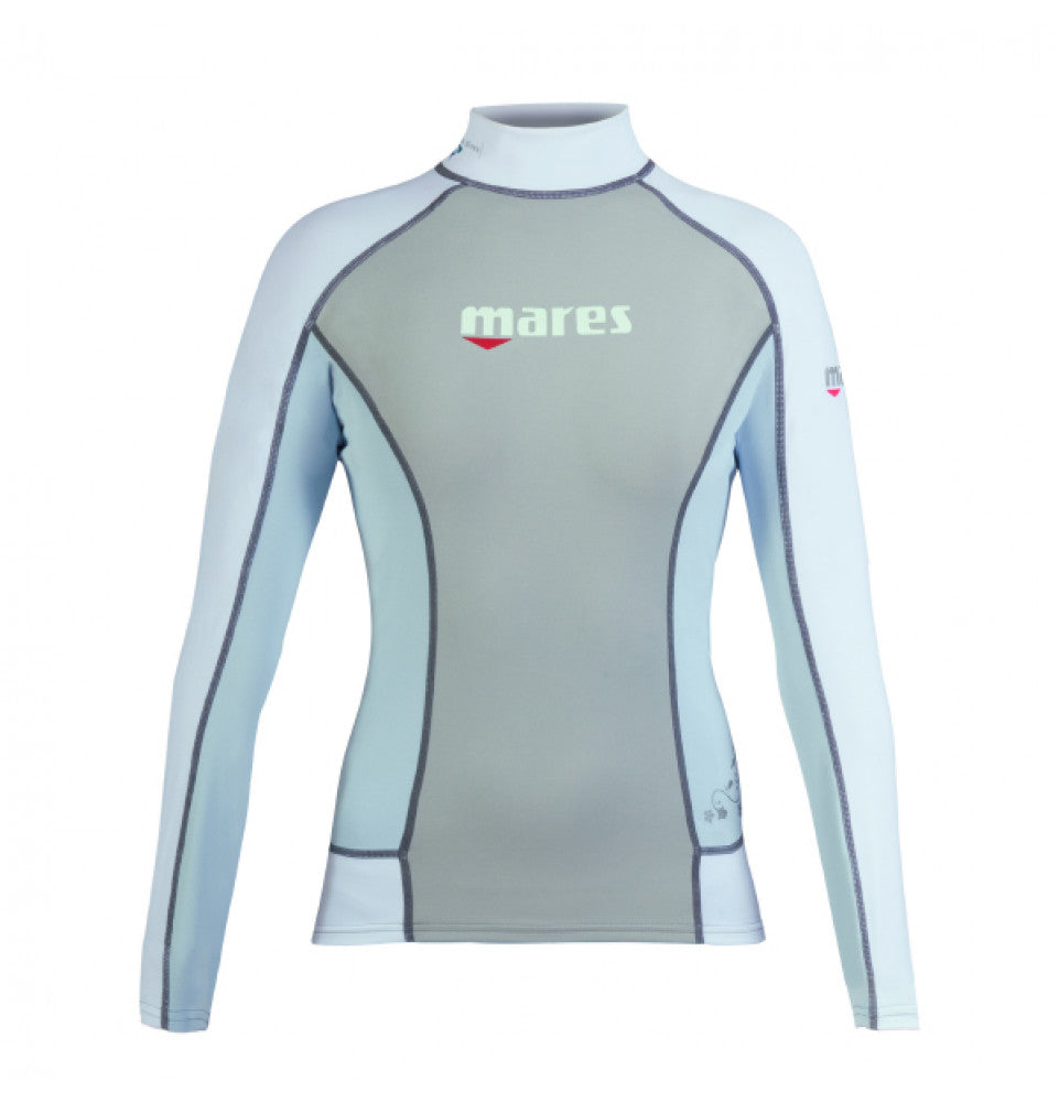Women's long-sleeved rash guard with UPF 30+ protection. It can be used for water sports and is made of a lightweight material that is quick-drying and comfortable.